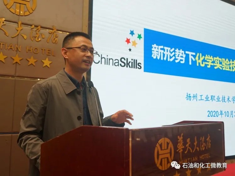 高職化學(xué)實(shí)驗(yàn)技術(shù)賽項(xiàng)專(zhuān)家組成員、揚(yáng)州工業(yè)職業(yè)技術(shù)學(xué)院化工工程學(xué)院院長(zhǎng)錢(qián)琛作《全國(guó)職業(yè)院校技能大賽改革試點(diǎn)賽化工類(lèi)賽項(xiàng)(高職)規(guī)程與理念》報(bào)告。